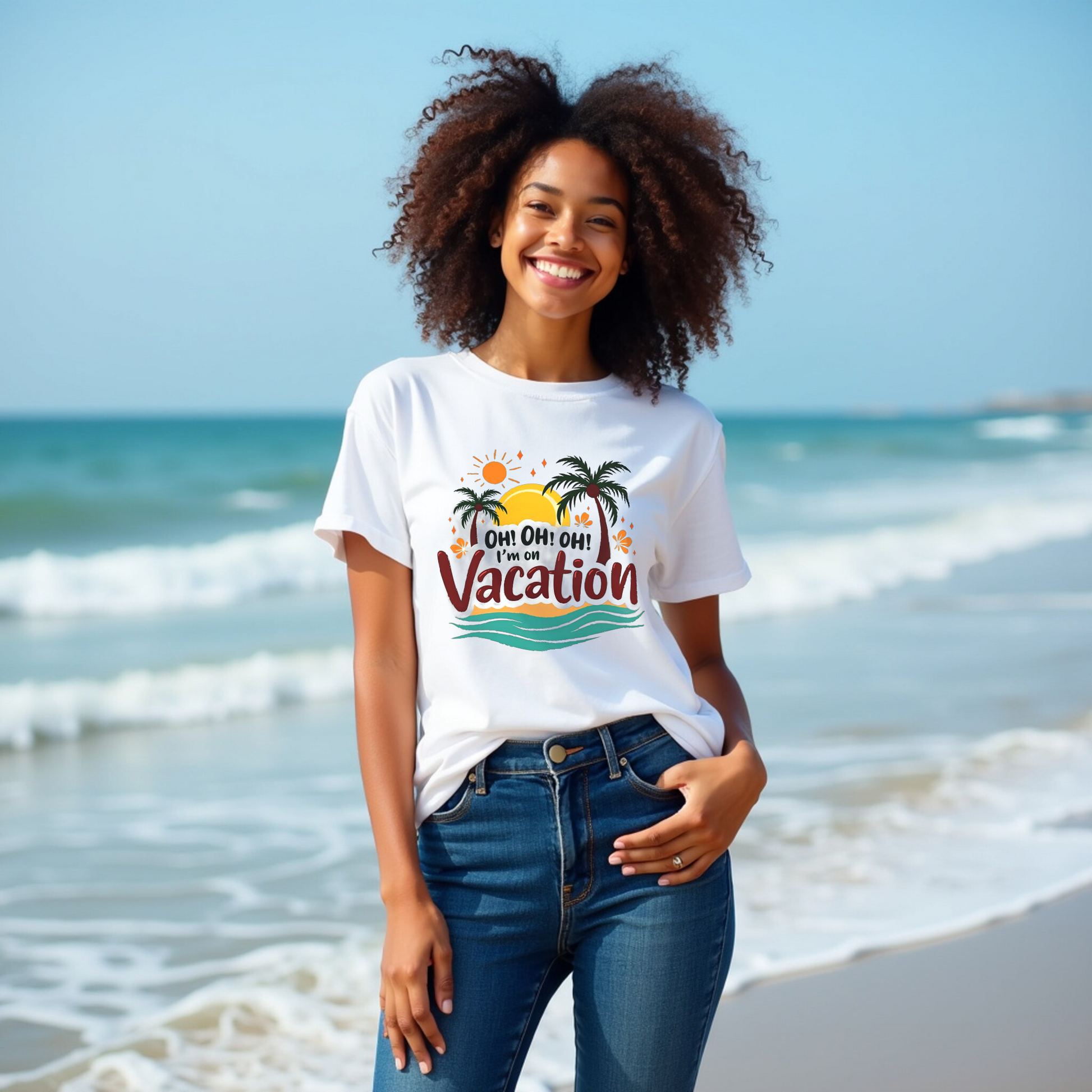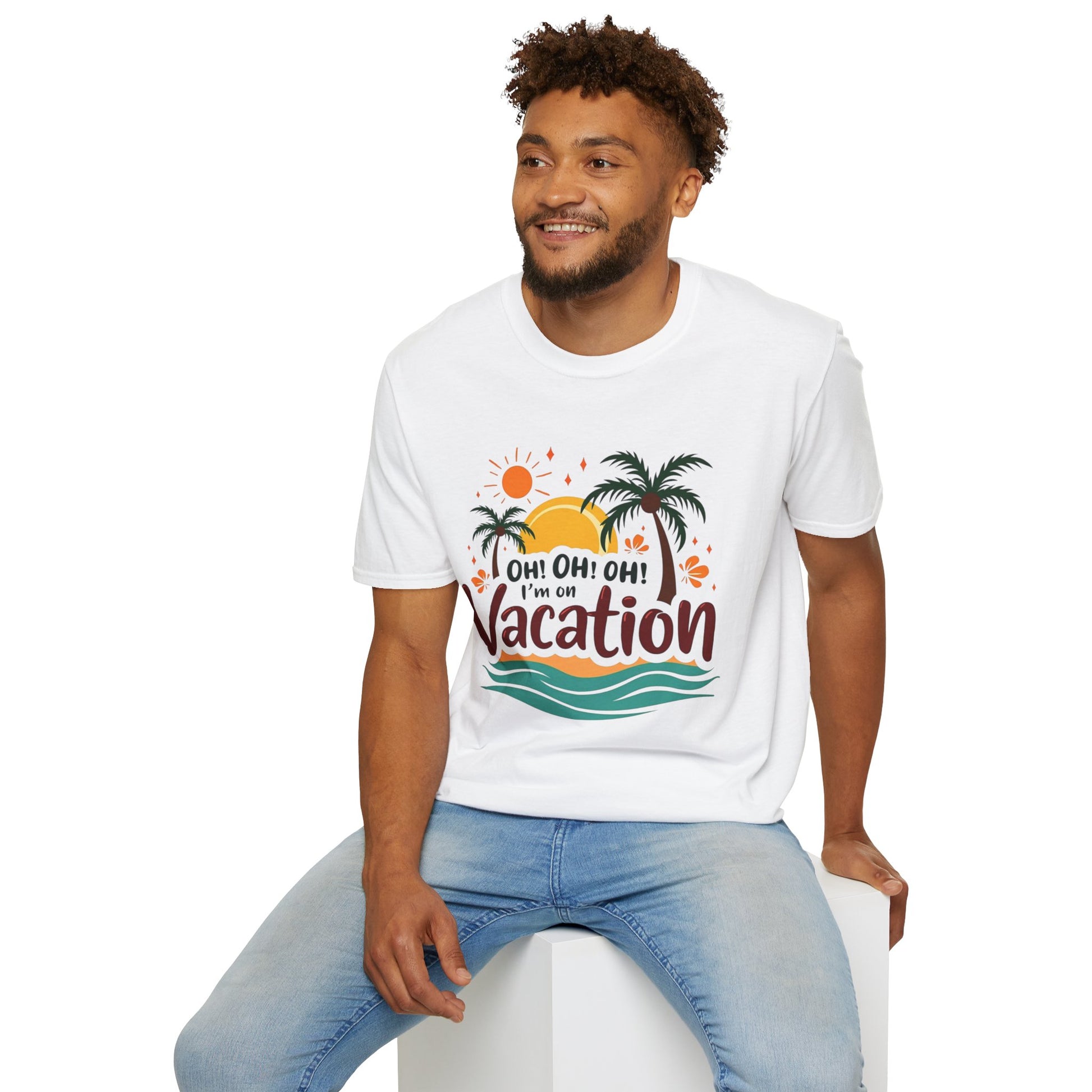 This T-Shirt with 'Oh Oh Oh I'm on Vacation' design brings a relaxed and carefree vibe, perfect for those looking to showcase their vacation spirit. It is ideal for adults who love to travel and enjoy some time off. This T-Shirt is perfect for summer holidays, beach getaways, or simply lounging at home.